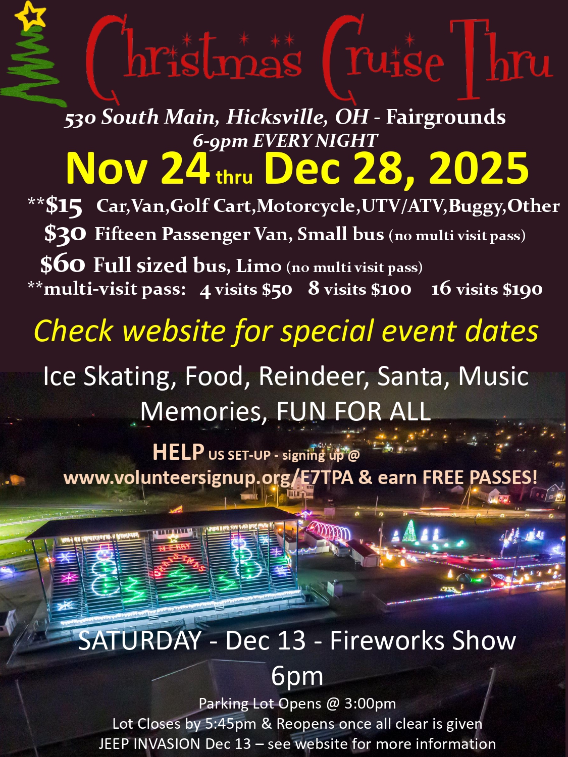 Parking Lot opens at 3pm – COME EARLY CCT Entry queue closes from 5:45-6:40 – Entry Required Once we get the all clear from our fire dept we will send the cars into the light show. Safety is our #1 concern. PLAN AHEAD the town gets busy. Hopefully, we will not have road construction, but if we do, please plan accordingly. COME EARLY!! Suggested Routes: From East: Jericho Road turn right on Clemmer Road; From West: SR 2 Turn right on Casebere Miller Road left on Jericho Road left on Clemmer Road; (Clemmer Road turns into Main Street, where our entrance is located. COME VERY EARLY!